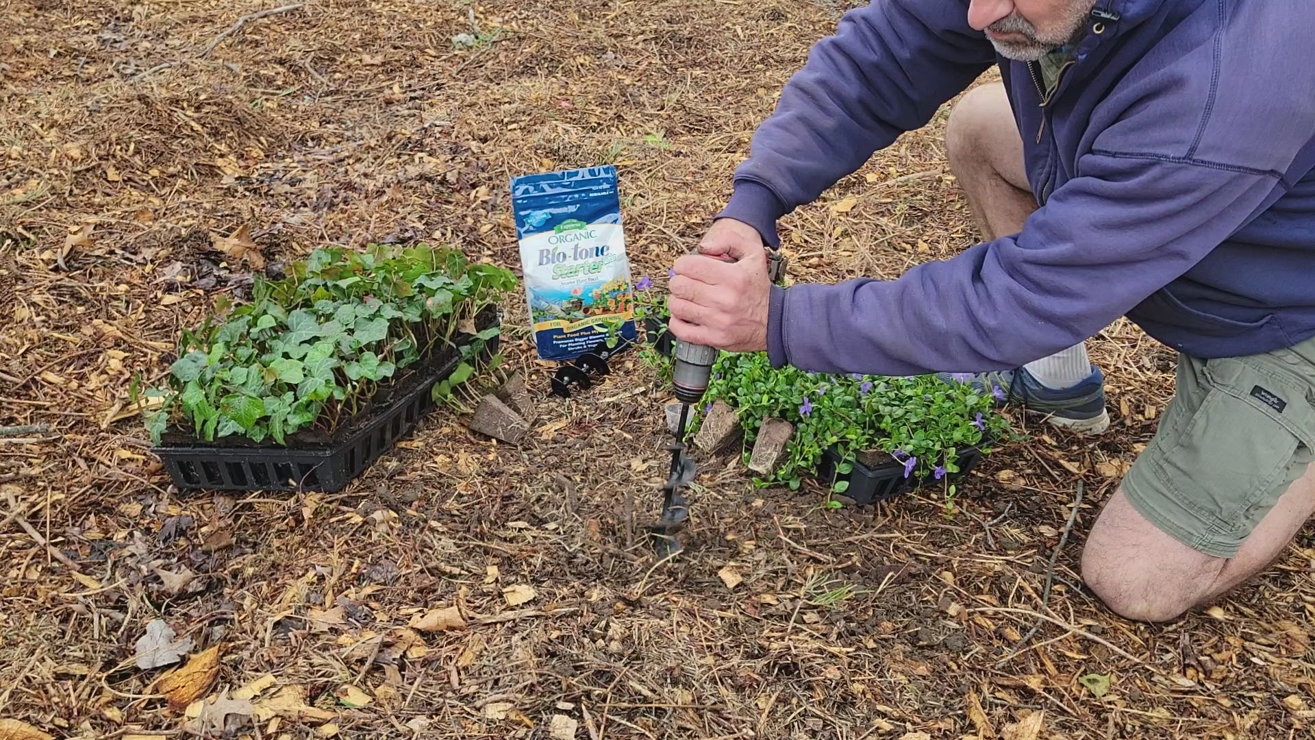 Step 2 - Cluster Planting Method: Plant Pachysandra in clusters of 2 pots per hole, creating 25 planting spots total. This technique simplifies watering and promotes faster, more uniform coverage.